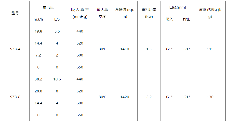 目前制造的本型號泵有:SZB—4、SZB-8。其中4(8)表示當水銀柱高為520毫米時的氣量(升/秒)。